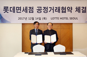 (조세금융신문=신경철 기자) 롯데면세점은 14일 서울 소공동 롯데호텔에서 국내 중소‧중견 브랜드와의 공정한 거래 문화 정착을 위해 60개 파트너사와 ‘공정거래협약 체결식’을 진행했다고 밝혔다. 롯데면세점은 파트너사를 상대로 판촉행사 비용 분담 기준을 설정하고 대금 결제 기한을 개선하는 등 다양한 동반성장 방안을 발표하기도 했다. 이날 공정거래협약 체결식에는 김태호 롯데면세점 상품전략 부문장을 비롯한 관련 부문 임원들과 60개의 파트너사를 대표해 권오섭 메디힐 엘앤피코스메틱 대표 등 9개 브랜드 대표들이 참석했다. 롯데면세점은 공정한 거래를 위해 ▲파트너사 선정, 거래 개시 및 중단 등에 대한 공정한 기준 설정과 운용 ▲판촉행사비 및 매장 인테리어 비용 분담에 적절한 기준 설정과 충분한 협의 보장 ▲공정한 거래를 위한 표준거래계약서 적용 강화 ▲결제 대금지급 기일 및 결제수단 개선 등 파트너사와의 구체적인 상생 실천 방안을 약속했다. 또한 이번 공정거래 협약 파트너사는 롯데면세점이 진행하는 ‘상생금융 프로그램’의 첫 대상이 되기도 했다. 상생금융 프로그램은 지난 4월 중소중견 납품업체의 금융지원을 위해 한국 수출입은행과 체결한 업무협약의 일환이다. 파트너사는