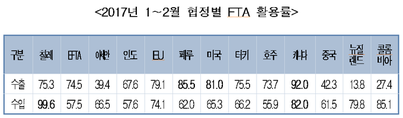 (조세금융신문=신경철 기자)자유무역협정(FTA)을 체결한 국가와의 교역이 지난해 대비두 자릿수 증가율을 보였다. 관세청은 ‘2월 FTA 교역현황’ 발표에서 올해 1월부터 2월까지 누적으로 FTA 체결국과의 교역이 수출 597억 달러, 수입 454억 달러를 기록했다고 27일 밝혔다. 이는 전년 동기대비 수출은 16.7%, 수입은 13.7% 증가한 수치다. 현재 우리나라가 맺은 FTA 협정은 총 15개(52개국)로 전체 무역비중의 약 68%를 차지하고 있다. 협정별 FTA 활용률은 수출 63%, 수입 66.9%로 전년 동기 대비 수출은 0.3% 증가, 수입은 1.7% 증가했다. 올해 협정 2년차인 중국, 뉴질랜드, 콜롬비아 등 3개국 협정 실적이 반영됨에 따라 지난해 FTA 활용률(수출 72.2%, 수입 73.1%)에 비해 다소 낮아졌다. FTA 활용률이란 전체 FTA특혜대상품목 대비 실제 FTA 특혜가 적용된 수출입 금액 비율을 말한다. 협정별로는 캐나다(92%), 페루(85.5%), 미국(81%), 수입은 칠레(99.6%), 캐나다(82%) 등이 FTA 수출활용률 상위를 기록했다. 특히 최대교역국인 중국은 수출활용률이 지난해 말 33.9%에서 올해 2월 42