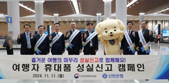 (조세금융신문=안종명 기자) 관세청과 한국면세점협회 주관 행사로 여행객의 면세산업 활성화를 위해 마련된 '코리아듀티프리페스타'가 이달 말인 11월 30일까지 진행됨에 따라 인천공항세관이 여행자휴대품 성실 자진신고 문화 조성 캠페인에 나섰다. 아울러 대국민 민간 공익홍보사업을 추진 중인 정상혁 신한은행장과 임직원들도 캠페인에 동참했다. 인천공항본부세관(이하 인천공항세관)은 지난 11일 인천공항 제2여객터미널 1층 입국장에서 해외여행자를 대상으로 여행자휴대품 성실신고 홍보 캠페인을 실시했다고 밝혔다. 세관은 면세업 업계 쇼핑축제로 불리는 '코리아듀티프리페스타' 행사기간(11.9~11.30) 동안 해외여행자의 면세물품 구매가 증가할 것으로 내다보고, 이번 캠페인을 마련했다. 인천공항세관에 따르면 해외 여행자는 면세범위 초과물품을 국내로 반입 시 종이신고서 또는 모바일 '여행자 세관신고' 앱을 이용해 신고할 수 있으며 성실신고의 경우 납부할 관세의 30%를 감면(20만원 한도 내) 받을 수 있다. 여행자 휴대품 면세범위는 ▲미화 800만달러, ▲주류는 2병으로 2ℓ 이하, (미화 400달러 이하) ▲담배(궐련 200개비 이내) ▲향수(100㎖ 이하)는 면세범위(미화