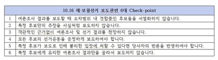 (조세금융신문=안종명 기자) 인터넷신문윤리위원회(위원장 이재진, 이하 인신윤위)는 다음달 16일 재·보궐선거를 앞두고, 공정한 선거보도를 위해 자율심의 참여서약사들을 대상으로 6대 유의사항을 안내했다고 25일 밝혔다. 인신윤위는 서울 및 부산, 인천, 전남 등에서 치러지는 ‘10.16 재·보궐선거’를 앞두고, 기존 선거보도 심의에서 위반사례로 주로 지적되온 기사를 분석했다. 그 결과 오차범위 내 경합중인 후보들을 서열화하지 않고, 특정 후보만의 주장을 사실처럼 보도하지 않으며, 객관적인 근거없이 여론조사 및 선거 결과를 전망하지 않는 걸로 파악됐다. 인신윤위는 이에 따라 6대 체크포인트를 확인 및 안내했다. 인신윤위는 6대 체크포인트에 따라 공직선버를 앞두고 선거 여론조사 보도준칙에 근거해 모니터닝과 심의 활동을 더욱 강화할 계획이다. 인신윤위가 밝힌 6대 체크포인트는 ▲여론조사 결과를 보도할 때 오차범위 내 경합중인 후보들을 서열화 하지 않기 ▲특정 후보만의 주장을 사실처럼 보도하지 않기 ▲객관적인 근거없이 여론조사 및 선거결과를 전망하지 않기 ▲모든 후보의 선거운동을 공정하게 보도 ▲특정 후보가 보도로 인해 불리한 입장에 처할 수 있다면 당사자의 반론을