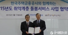 유상규 주택금융공사 이사(왼쪽)와 최종태 재단법인 함께일하는재단 이사가 15일 서울 마포구 월드컵북로에 있는 함께일하는재단 본사에서 ‘취약계층 돌봄서비스’ 사업 협약 체결 후 기념촬영. (조세금융신문=양학섭 기자) 주택금융공사(HF,사장김재천)는15일재단법인함께일하는재단(이사장송월주)과‘취약계층돌봄서비스’사업협약을체결했다고밝혔다.공사와‘함께일하는재단’은돌봄서비스사업을수행할사회적기업을공모를통해선발후사업비를후원해장애인,고령자등취업이어려운계층을돌보미로채용해노약자,저소득산모등을위한돌봄서비스를지원할계획이다.공사관계자는“공사는지난2011년부터함께일하는재단과노약자&