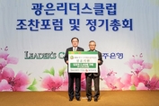 광은리더스클럽 조찬포럼에서 인사말을 하고있는 김장학 광주은행장.광주은행(은행장 김장학)은 26일 홀리데이인 광주호텔에서 지역 중소기업 CEO 130여명이 참석한 가운데 ‘광은리더스클럽(회장 김홍균) 조찬포럼 및 정기총회’를 개최했다. 이날 행사에서는 지역의 국제행사인 ‘완도국제해조류박람회’의 붐 조성을 위한 입장권 구매행사를 갖고, 입장권 일천이백만원(2,400매) 상당을 구입하여 성공적인 박람회 개최를 기원했다. 또한 IBK자산운용 김홍일 부사장을 초빙하여 ‘지적재산권이 회사에 미치는 영향’을 주제로 한 초청강연을 열었다. 특히 창조경제의 토대가 되는 지적재산권을 통한 경제적 가치창출, 지적재산권을 활용한 금융상품 개발 및 트렌드 등의 참신한 내용으로 참가자들에게 뜨거운 관심을 받았다. 김홍균 리더스클럽 회장은 “강인한 기업가 정신으로 우리지역 경제성장을 견인해온 광은리더스클럽은 화합과 상생, 존중과 배려를 실천하여 지역사회의 희망적인 미래와 지역경제의 활력을 높이기 위해 사회적 책임을 다하겠다” 고 말했다. 광주은행 김장학 행장은 “광은리더스클럽은 2007년 9월 창립이래 다양한 사회적 활동과 회원사간의 교류를 통해 지역사회의 창조적인 미래를 밝히는 소