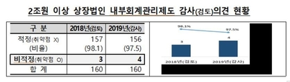대형 상장법인을 대상으로 작년 처음 내부회계 감사제도가 도입된 결과 4곳이 비적정의견(중요한 취약점 발견)을 받았다. 29일 금융감독원에 따르면 자산 2조원 이상 상장법인 160곳에 대한 외부감사인의 2019회계연도 내부회계 감사 결과 156곳(97.5%)이 적정의견을 받았다. 비적정의견을 받은 기업은 4곳(2.5%)에 그쳤다. 이들은 주로 손상인식, 리스회계, 충당부채 측정, 금융상품 회계처리 등 재무제표 작성 과정과 관련한 통제 미비점을 중요한 취약점으로 지적받았다. 금감원은 "미국에 내부회계 감사가 도입된 직후와 비교하면 이 같은 비적정의견 비율은 다소 낮은 수준"이라며 "대형 상장법인은 상대적으로 풍부한 인적·물적 인프라를 활용하여 내부회계 감사를 효과적으로 준비했다"고 평가했다. 다만, 내부회계 감사에서 비적정의견을 받은 4개 회사 모두 재무제표 감사에서는 적정의견을 받았다. 내부회계관리는 재무정보의 신뢰성을 확보하기 위해 회사가 갖추고 지켜야 할 내부통제 시스템이다. 새 외부감사법 시행으로 상장사 내부회계관리에 대한 외부감사인의 인증 수준이 기존의 '검토'에서 '감사'로 상향됐다. 이에 따라 외부 회계법인이 상장사의 내부통제 시스템이 미흡하다고 판