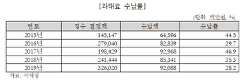 국세청이 지난해 과태료를 부과해놓고 실제로 걷은 비율이 30%에 못 미친 것으로 나타났다. 13일 국회예산정책처의 2019회계연도 결산 분석 보고서에 따르면, 국세청은 지난해 과태료 징수결정액 3천260억원 가운데 921억원(28.2%)만 수납하는 데 성공해 수납률이 저조했다. 국세청은 국세기본법, 소득세법 등 조세 관련 법률 위반 행위에 대한 제재금으로 과태료를 부과한다. 최근 5년간 과태료 수납률을 보면 2015년 44.5%, 2016년 29.7%, 2017년 46.9%, 2018년 35.3%, 2019년 28.2% 등이다. 과태료 수납률 저하 원인을 살펴보면, 작년 과태료 징수 결정액의 90%를 차지하는 현금영수증 발급의무 위반 과태료 수납률이 특히 감소했다. 현금영수증 발급의무 위반 과태료 수납률은 2016년 26.8%에서 2017년 44.1%로 상승했으나 2018년 32.8%, 2019년 25.8%로 크게 하락했다. 이에 대해 국세청은 "징수결정액은 징수 가능성이 낮은 전년도 미수납액을 포함하고 있어 매년 증가할 수밖에 없는 구조적인 이유가 있고, 현금영수증 발급의무 위반 과태료는 대부분 세무조사에 의해 국세와 함께 부과되는데 국세와 동시에 체납되는