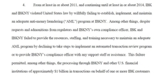 IBK기업은행이 약 10년 전 이상 거래 적발을 위해 뉴욕지점의 자금세탁방지(AML) 프로그램을 개선해야 한다는 준법 감시인의 지속적인 건의에도 미온적인 대응을 한 것으로 나타났다. 준법 감시인의 제안에도 적절한 조치를 하지 않아 기업은행은 한 무역업체의 이란 제재 위반 사건과 관련한 위장 거래를 적시에 적발하지 못했다. 결국 기업은행은 자금세탁방지법 위반 혐의로 미국 사법당국과 뉴욕주 금융청에 총 1천억원가량의 벌금을 내야 한다. 25일 기업은행과 미국 뉴욕 남부지검 간 합의서에 따르면 양측은 지난달 20일 8천600만달러(약 1천49억원)의 벌금에 합의했다. 이에 따라 미 검찰은 기업은행 뉴욕지점에 대한 기소를 2년간 유예했다. 합의서는 기업은행과 은행 뉴욕지점이 2011∼2014년 뉴욕지점에 적절한 자금세탁 방지 프로그램을 마련해 운영하는 것을 '의도적으로'(willfully) 이행하지 않아 미국 법을 위반했다고 적시했다. 뉴욕지점 내 준법 감시인의 지속적인 요청과 경고에도 기업은행이 적절한 프로그램을 운영하기 위한 자원과 인력을 제공하지 않았다고 합의문은 설명했다. 기업은행은 2011년 2∼7월 무역업체 A사가 기업은행에 개설된 이란 중앙은행 명의 계