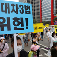 "전 국민이 '부동산 블루'(우울증)를 넘어 '부동산 분노조절장애'가 걸렸습니다. 이 정권처럼 매주 국민에게 이토록 정신적인 고통과 물질적인 피해를 주는 정권이 있었습니까?" 8일 서울 여의도 LG트윈타워 맞은편 여의대로에서는 계약갱신청구권, 전월세상한제 도입을 골자로 하는 개정 주택임대차보호법 시행과 정부의 고강도 부동산 규제 정책에 항의하는 '6·17 규제 소급적용 강력반대' 집회가 열렸다. 이날 집회는 '6·17 규제 소급적용 피해자모임', '7·10 취득세 소급적용 피해자모임', '임대사업자협회 추진위원회' 등이 주최했다. 집회 시작 직후 제법 굵은 빗방울이 떨어졌지만 참가자들은 아랑곳하지 않고 우비를 입거나 우산을 쓴 채 3개 차로와 인도에 약 200m 구간을 채웠다. 주최 측은 참가자를 1천명으로 추산했다. 6·17 부동산 악법 저지 대책위원회 대표인 40대 주부 강모씨는 "문재인 정권은 '공정한 나라를 만들겠다'더니 이렇게 서민을 짓밟고 빈부격차를 심화시키고 있다"며 "노영민 대통령 비서실장을 솎아내려 하는 것도 '생쇼'"라고 주장했다. 강 대표는 이어 "부동산 악법 저지 운동을 벌이는 우리는 '태극기', '틀딱', '수구 친일파'가 아니라 대한