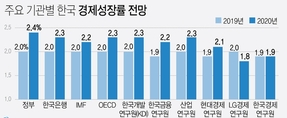 2020년 경제는 올해보다 완만하게나마 개선되는 흐름을 보일 것이라는 전망이다. 다만, 반등 모멘텀이 강하지 않고 미중 무역갈등과 같은 굵직한 대외 변수를 둘러싼 불확실성은 아직 남아있는 점을 고려하면 내년에도 한국 경제가 녹록지 않다는 전망이다. 26일 국내외 주요 기관들의 내년도 한국경제 성장률 전망치를 종합하면 우리 경제는 내년 중 2.2∼2.3%의 성장률을 보일 것으로 예상된다. 국제통화기금(IMF)이 2.2%로 내다봤고, 한국은행·한국개발연구원(KDI)·경제협력개발기구(OECD)가 2.3%를 예상했다. 정부는 여기에 정책 의지를 보태 2.4%를 제시했다. 1.9∼2.0%에 머물 것으로 예상되는 올해와 비교하면 내년에는 경기가 다소간 개선될 것이란 게 이들 기관의 전망이다. 이런 전망의 주된 근거는 올해 부진했던 설비투자와 수출의 개선 예상이다. 지출 측면에서 우리나라의 경제구조(2018년 기준·통계상 불일치 등 제외)를 살펴보면 민간소비가 48%, 정부소비가 16%, 건설투자가 15%, 설비투자가 9%, 지식재산물투자가 6%, 순수출이 5%를 각각 차지한다. 설비투자와 수출은 민간소비와 비교해 경제에서 차지하는 비중이 작지만, 변화폭이 상대적으로 크