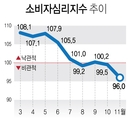 경기둔화 우려가 커지면서경기비관론이 더 커졌다. 한국은행이 27일 발표한 '2018년 11월 소비자동향조사 결과'를 보면 이달 소비자심리지수(CCSI)는 96.0으로 전월보다 3.5포인트 하락했다. CCSI는 소비자의 체감 경기를 나타내는 지표다. 2003∼2017년 CCSI 장기평균을 기준값 100으로 설정해 CCSI가 100보다 작으면 소비심리가 장기평균보다 비관적임을 뜻한다. 이달 소비자심리지수는 작년 2월(93.9) 이래 21개월 만에 가장 낮다. 탄핵정국인 작년 3월(96.3)과 비슷한 수준이다. 한은은 "미중 무역분쟁 지속에 따른 국내외 경기둔화 우려, 고용지표 부진, 주가하락 등으로 경기관련 지수가 하락한 가운데 생활물가 상승 등 영향으로 가계 재정상황 관련지수도 약세를 보이며 소비자심리지수가 하락했다"고 설명했다. CCSI를 구성하는 6개 지수 모두 하락했다. 현재 경기판단CSI(62), 향후경기전망CSI(72)는 각각 5포인트 하락했다. 현재생활형편CSI(90)와 생활형편전망CSI(90)는 1포인트씩, 가계수입전망CSI(97)와 소비지출전망CSI(108)는 2포인트, 3포인트 각각 내렸다. 생활형편전망은 2011년 3월(90)