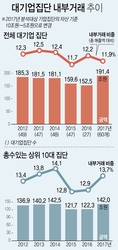 총수가 있는 상위 10대 집단의 내부거래가 지난해크게 증가한 것으로 나타났다. 특히 총수일가 2세 지분율이 높은 회사일수록 내부거래 비중이 높은 것으로 조사됐다. 공정거래위원회는 10일 이런 내용이 담긴 '2018년 공시대상기업집단 내부거래 현황'을 공개했다. 공개 대상은 올해 5월 1일 공시대상기업집단(자산 총액 5조원 이상)으로 지정된 60개 집단 소속 계열사 1779개의 작년 한 해 내부거래 현황이다. 작년까지는 자산 10조원 이상 집단만 공개했지만, 올해부터 자산 5조∼10조원 집단도 공개 대상이 됐다. ◇ 총수 있는 10대 기업 내부거래 비중·금액 모두 증가 공시집단의 내부거래 금액은 총 191조4000억원, 전체 매출에서 차지하는 비중은 11.9%였다. 내부거래 비중이 높은 집단은 셀트리온(43.3%), 중흥건설(27.4%), SK(26.8%) 순이었다. 금액으로 보면 SK(42조8000억원), 현대자동차(31조8000억원), 삼성(24조원)이 많았다. 셀트리온은 생산과 판매업체 분리에 따라 내부거래가 많았다. 중흥건설은 시행사·시공사 간 내부거래가, SK·현대차·삼성은 수직계열화에 따른 내부거래가 각각 많았다고 공정위는 분석했다.