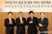 4월 16일 오전 서울 용산구 LG유플러스 용산 신사옥에서 열린 '모바일 카드 발급 및 결제 서비스 업무 제휴 협약식' 후 김덕수 KB국민카드 사장(왼쪽에서 첫 번째), 윤종규 KB금융그룹 회장(왼쪽에서 두 번째), 거화용 차이나유니온페이 및 유니온페이인터내셔널 동사장(왼쪽에서 세 번째), 이상철 LG유플러스 부회장(왼쪽에서 네 번째)이 기념 촬영을 하고 있다. <사진=국민카드 제공>(조세금융신문=옥정수 기자)KB국민카드가중국모바일카드결제시장에국내카드업계최초로진출한다.빠르면7월부터KB국민카드고객들은국내에서발급받은KB모바일카드로중국에서결제가가능해진다.KB국민카드(사장김덕수)는16일오전LG유플러스용산신사옥에서윤종규KB금융그룹회장과김덕수KB국민카드사장,거화용(葛华勇)차이나