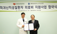 생보재단 유석쟁전무(오른쪽)와 김준식 병원장이 '희귀난치성질환자 의료비 지원사업'을 위한 업무협약을 체결했다.(조세금융신문) 생명보험사회공헌재단(이하생보재단)은가톨릭관동대학교국제성모병원과‘희귀난치성질환자의료비지원사업’을위한업무협약을체결했다고5일밝혔다.이를바탕으로생보재단은 올해69곳의병원에서의료비12억9천만원등총17억3천만원을희귀난치성질환자들에게지원할예정이다.의료비지원대상은최저생계비기준250%이하가구(4인기준월소득417만823원)다.선정된가구는1인당연간최대500만원의입원및수술비,외래치료비및검사비,희귀의약품구입비가지원받을수있다.&nbs