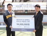 KB국민카드 김덕수 사장(왼쪽)이 이호경 독거노인종합지원센터장에게 독거 노인 생활 안정 및 지원 사업을 위한 기부금 9천400만원을 전달하고 있다.(조세금융신문) KB국민카드(사장김덕수)는창립4주년을맞아 '독거노인을위한주거환경개선봉사활동'을펼쳤다고3일밝혔다.이날김덕수KB국민카드사장과본사임직원50여명은서울은평노인종합복지관에서복지관외벽벽화그리기,복지관방문어르신을위한간식지원등의활동을가졌다.또은평구내독거노인가구5곳을방문해도배,장판교체,봄맞이대청소등주거환경개선활동과 함께쌀,휴지