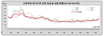 (조세금융신문=이유리나 기자) 겨울철 찬 공기로 천식이 악화돼 응급실에 내원하는 고령 환자가 1월부터 증가하므로 고령환자의 각별한 주의가 요구된다. 12일 보건복지부와 국립중앙의료원 중앙응급의료센터가 지난 5년간(2011년~2015년)의 응급의료 데이터를 분석한 결과, 천식으로 인해 응급실에 내원한 60세 이상 고령 환자가 1월부터 3월까지 눈에 띄게 증가하는 것으로 나타났다. 최근 5년 동안 연평균 2만 1,697명의 천식환자가 응급실에 방문했고, 특히 9월(10.7%)과 10월(10.0%) 등 가을철에 많이 발생하는 것으로 나타났다. 하지만 60세 이상 고령 환자는 2월(12.1%), 1월(11.1%) 등 추운 겨울에 높게 나타나는 것으로 분석됐다. 응급실에서 진료 받은 천식 고령 환자의 62.3%가 입원을 하여, 다른 연령군과 비교해 두 배 이상의 입원율을 보였으며, 입원환자의 18.3%는 중환자실에 입원한 것으로 분석됐다. 특히 고령 천식 환자 0.5%는 병원에 도착 전 사망하거나 응급실내에서 사망한 것으로 나타나, 다른 연령 군(15세미만 0.0%, 15세~59세 0.1%)에 비해 상대적으로 높은 비율을 보였다 고령환자가 응급실에 내원해 호소한 주