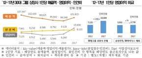 (조세금융신문=이한별 기자)30대 그룹 상장사가 최근 5년새 1인당 인건비는 증가한 반면 매출액은 줄어든 것으로 나타났다. 4일 한국경제연구원이 진행한 ‘2012년~2017년 30대 그룹 상장사 인건비, 재무실적 분석(182개사)’ 조사에 따르면 1인당 인건비는 2012년 7841만원에서 작년 9133만원으로 1292만원 오른 것으로 조사됐다. 반면 같은 기간 1인당 매출액은 10억7547만원에서 10억1815만원으로 5732만원 감소했다. 작년 30대 그룹 상장사의 1인당 매출액은 10억1815만원, 1인당 인건비는 9133만원, 1인당 영업이익은 1억606만원으로 나타났다. 각 지표를 2012년과 비교하면 1인당 매출액은 5732만원 감소, 인건비는 1292만원 증가, 영업이익은 3481만원 증가했다. 다만 삼성전자와 SK하이닉스를 제외하면 소폭 증가(79만원)에 그친 것으로 나타났다. 한경연은 “작년 세계교역(10.6%)과 세계성장률(3.8%)이 개선되고 반도체 호황 등 여건이 나아져 기업 매출과 이익이 늘었지만 삼성전자와 SK하이닉스를 제외하면 사실상 4~5년 전 수준”이라고 평가했다. 작년 반도체 호황으로 삼성전자와 SK하이닉스의 영업이익