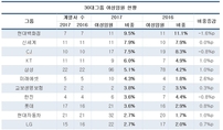 (조세금융신문=이한별 기자) 국내 30대 그룹 여성 임원 비중이 처음으로 3%대를 돌파한 것으로 나타났다. 특히 현대백화점, 신세계 등 유통 그룹의 여성임원 비중이 압도적으로 높았다. 반면 NH농협, LS, 영풍 등 7개 그룹은 여성 임원이 한 명도 없었다. 16일 CEO스코어(대표 박주근)가 국내 30대 그룹 계열사 중 지난해 사업보고서를 제출한 268개 사의 여성 임원 현황을 조사한 결과 전체 8835명 중 여성은 274명으로 3.1% 비중을 차지했다. 이는 전년도 2.5%에서 0.6%포인트 상승한 것으로 ‘3% 벽’을 넘은 것은 이번이 처음이다. 초임 임원으로 분류되는 상무급 여성 임원은 2.6%(210명)로 0.4%포인트, 전무 이상 고위급 여성임원은 0.4%(31명)로 0.1%포인트 각각 상승했다. 이번 조사에서 2개 이상 기업의 겸직 임원은 각 1명으로 계산했고 임원별 직위를 구분하지 않는 SK그룹은 직위별 조사에서 제외했다. 30대 그룹 중 여성임원 비중이 가장 높은 곳은 현대백화점 그룹이었다. 전체 임원 116명 중 여성 임원이 11명으로 9.5%를 차지했다. 11명 중 7명은 패션전문기업 한섬 소속이었고 현대백화점(3명)과 현대그린