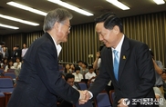 (조세금융신문=전한성 기자) 혁신안 관련 당규 개정 등을 위해 열린 새정치민주연합당무위원회의가 13일 오전 서울 여의도 국회에서 열린 가운데 문재인(왼쪽) 대표와 김상곤 혁신위원장이 악수를 나누고 있다.