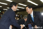 (조세금융신문=전한성 기자) 혁신안 관련 당규 개정 등을 위해 열린 새정치민주연합당무위원회의가 13일 오전 서울 여의도 국회에서 열린 가운데 이종걸(왼쪽) 원내대표와 김상곤 혁신위원장이 악수를 나누고 있다.