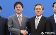 (조세금융신문=전한성 기자) 새누리당 유승민(왼쪽) 원내대표와 새정치민주연합 우윤근 원내대표를 비롯한 여야 원내지도부가 4일 오전서울 여의도 국회에서 열린 마지막 주례회동에서 악수를 나누고 있다.