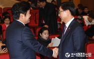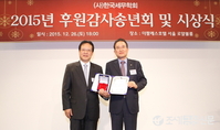 (조세금융신문=전한성 기자) '한국세무학회 2015년 후원감사송년회 및 시상식'이 26일 오후 서울 서초구 더팔레스호텔에서 열린 가운데 백운찬(오른쪽) 한국세무사회장이 표창장을 수상한 후홍기용 회장과 기념촬영을 하고 있다.