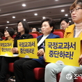 (조세금융신문=전한성 기자) 새정치민주연합 전국여성위원회가 주최하는 '역사교과서 국정화 저지를 위한 학부모 간담회 - 국정화 교과서 무엇이 문제인가?'가 20일 오전 서울 여의도 국회 의원회관에서 열린 가운데 새정치민주연합 유은혜(왼쪽부터), 도종환, 서영교 의원이 피켓을 들고 구호를 외치고 있다.
