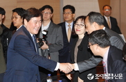(조세금융신문=전한성 기자) 최경환경제부총리 겸 기획재정부장관이 11일 오후 서울 여의도 중소기업중앙회를 찾아 중소·벤처기업인 대표들과 간담회를 갖은 가운데 참석자들과 악수 나누고 있다.최 부총리는 이날모두발언을 통해 "9월 산업생산이 4년 반 만에 최대폭으로 증가(2.4%)하는 등 최근 우리경제가 내수를 중심으로 회복세를 보이고 있다"고 평가하며 "향후 경기획복의 모멘텀이 더욱 공고해지도록 4/4분기 중 9조원 이상의 유효수요를 확대할것이라고 밝혔다.