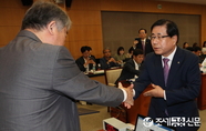 (조세금융신문=전한성 기자)농협경제지주에대한 국회 농림축산식품부해양수산위원회의 국정감사가 7일 서울 중구 새문안로 농협중앙회에서 열린 가운데 이기수 축산경제대표이사가 김우남 위원장과 악수 나누고 있다.