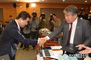 (조세금융신문=전한성 기자) 농협중앙회·농협금융지주·NH개발·농협자산관리·농협정보시스템·농협생명보험·농협손해보험·NH투자증권·NH-CA자산운용·농협캐피탈·NH선물·NH저축은행에 대한 국회 농림축산식품부해양수산위원회의 국정감사가 6일 서울 중구 새문안로 농협중앙회에서 열린 가운데 최원병(왼쪽) 회장이 김우남 위원장과 악수 나누고 있다.