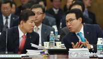 (조세금융신문=전한성 기자) 농협중앙회·농협금융지주·NH개발·농협자산관리·농협정보시스템·농협생명보험·농협손해보험·NH투자증권·NH-CA자산운용·농협캐피탈·NH선물·NH저축은행에 대한 국회 농림축산식품부해양수산위원회의 국정감사가 6일 서울 중구 새문안로 농협중앙회에서 열린 가운데 최원병(왼쪽) 농협중앙회장과 이상욱 농업경제대표이사가 대화 나누고 있다.