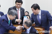 (조세금융신문=전한성 기자) 기획재정부·한국은행·한국수출입은행·한국조폐공사·한국투자공사·국제원산지정보원에 대한 국회 기획재정위원회의 종합감사가 5일 서울 여의도 국회에서 열린 가운데 주형환(왼쪽) 기획재정부 제1차관이 증인선서 후 정희수 위원장과 악수 나누고 있다.