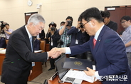 (조세금융신문=전한성 기자) 산업은행·기업은행·예금보험공사에 대한 국회 정무위원회의 국정감사가 21일 서울 여의도 산업은행 본점에서 열린 가운데 증인으로 출석한 고재호(오른쪽) 전 대우조선해양 대표이사가 정우택 위원장과 악수 나누고 있다.