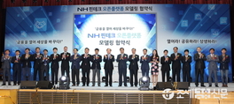 (조세금융신문=전한성 기자) 'NH핀테크 오픈플랫폼 모델링 협약식'이 26일 오후 서울 중구 새문안로 농협중앙회 대강당에서 열린 가운데 김주하 NH농협은행장을 비롯한 20개 업체 대표들이 기념촬영을 하고 있다.