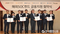 (조세금융신문=전한성 기자) '무역보험공사-6대 시중은행 해외SOC 펀드 금융지원 업무협약식'이 17일 오후 서울 중구 소공로 웨스틴 조선호텔에서 열린 가운데 임종룡(오른쪽 네번째) 금융위원장이 시중은행장들과 나란히 앉아 있다.