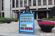 (조세금융신문) KB금융지주 임영록 회장의 징계 여부가 12일 오후 2시 금융위원회 전체회의에서 열린 가운데, KB국민은행 노조 신현철 국장이 금융위원회 앞에서임영록 회장의 사퇴를 촉구하는 피켓을 들고 있다.