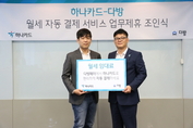 (조세금융신문=최일혁 기자) 하나카드는 부동산 O2O 플랫폼 ‘다방’을 서비스 중인 ㈜스테이션3와 11월 중 월세 카드 납부 서비스를 제공한다고 7일 밝혔다. 다방페이로 명명한 이 서비스는 임차인이 ‘다방페이’앱을 통해 월세 자동납부 카드를 등록하면 매월 납입일에 카드로 월세가 결제 되는 방식이다. 하나카드는 다방과 함께 다방페이 활성화를 위해 TV광고, 공인중개사 사무소 안내서 배포 등의 공동홍보도 진행 할 예정이다. 또한 하나카드는 손님들이 자주 이용하는 ‘이사’(한방이사), ‘생필품’(다이소), ‘생활편의’(GS25) 업종과 공동 마케팅을 통해 손님이 다방페이 등록 시 문자를 통해 할인쿠폰 제공 등의 혜택도 제공하게 된다. 한편 다방페이 서비스는 하나카드(구 외환카드 포함) 신용 및 체크카드로만 이용가능하며, 하나BC카드는 제외된다.