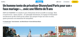 (조세금융신문=최주현 기자) 21일(현지시간) 프랑스 파리에서 북서쪽으로 40킬로쯤 떨어진 센에마른주 소재 디즈니랜드 파리에서 9살 우크라이나 소녀를 신부로 삼아 결혼식을 올리려던 4명의 성인들이 체포돼 관할 지방검찰청 조사를 받았다고 현지 <르 파리지엥>이 이날 보도했다. 혼주가 포함된 용의자 4명은 진짜 결혼식은 아니고 결혼 장면이 포함되는 영화촬영을 위해 놀이공원 개장 전인 이른 아침 결혼식을 위해 시설을 빌렸다고 진술했지만, 엑스트라로 동원된 사람들은 진짜 결혼식으로 알고 있었고 신부가 9살이라는 점은 몰랐던 것으로 확인됐다. <르 파리지앵>은 “놀이공원은 토요일 오전 개인 행사, 곧 결혼식을 위해 예약돼 있었던 게 분명했으며, 신부가 도착했을 때, 놀이공원 관리 당국은 신부가 아홉 살 우크라이나 소녀라는 사실을 알게 돼 곧바로 경찰에 신고했다”고 보도했다. 센에마른주 모(meaux) 지방검찰청은 심문을 위해 4명을 구금했다. 모지방검찰청 발표에 따르면, 신랑은 22세의 영국 국적자이고, 신부의 어머니는 41세로 확인됐다. 또 24세, 55세의 라트비아인 2명이 구금된 피의자들이다. 모지방검찰청은 <AFP>의 확인 취재