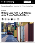 (조세금융신문=최주현 기자) 도널드 트럼프 미국 대통령의 관세정책 이래 미국을 런던과 유럽의 동맹국으로 생각하는 영국 시민의 비율이 역대 최저치로 떨어졌다. 영국인들은 심지어 미국을 ‘전반적으로 비우호적인 국가’로 생각하는 비율이 종전 9%에서 최근 17%로 증가했고, ‘유럽에 위협이 되는 나라’로 여기는 사람의 비율도 종전 3%에서 9%로 증가한 것으로 나타났다. 미국 매체 <블룸버그>는 24일(런던 현지시간) “영국의 인터넷 기반 시장 조사 및 데이터 분석 기업인 유고브 (YouGov)의 여론조사 결과, 지난 12월 ’미국을 런던과 유럽의 동맹국으로 생각한다’는 영국인이 42%였는데, 24일 발표된 조사에서는 기록이 시작된 2019년 이래 최저치인 30%로 떨어졌다”면서 이 같이 보도했다. 유고브에 따르면, 영국과 미국이 긴밀한 관계를 유지하고 있다고 생각하는 영국 시민의 비율은 작년 12월 41%에서 이번에 35%로 감소했다. 더욱이 같은 기간 “미국과의 관계가 약화되기를 원한다”고 응답한 영국 사람들의 비율은 13%에서 21%로 증가했다. 설문 참여자의 42%는 “영국이 유럽과 더 긴밀한 관계를 추구해야 한다”고 답했다. 유고브의 이번 설문