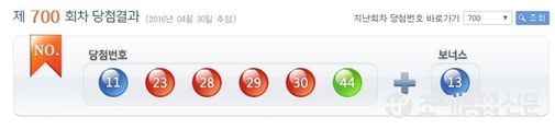 (조세금융신문=하지연 기자) 나눔로또가 제700회 로또당첨번호를 지난 30일 발표했다. 로또 700회 1등 당첨번호는 '11, 23, 28, 29, 30, 44'이다. 2등인 보너스 번호는 '13'이다. 나눔로또 제700회 당첨번호 6개를 모두 맞힌 1등 당첨자는 총 8명으로 각각 20억8,209만9,188원씩 받게 됐다. 당첨번호 5개와 보너스 번호가 일치한 2등은 41명으로 6,71만원씩 받게 된다. 당첨번호 5개를 맞힌 3등은 1,562명으로 각각 177만원씩 받는다. 당첨번호 4개를 맞힌 4등(고정 당첨금 5만원)은 8만2,874명, 당첨번호 3개가 일치한 5등(고정 당첨금 5,000원)은 141만4,076명이다. 제700회 로또 1등이 당첨된 복권명당은 ▲서울 광진구 구의동 '대림아크로리버상가102' ▲서울 동작구 사당동 '와이케이파트너스' ▲광주 광산구 소촌동 '빛고을로또' ▲경기 안양시 만안구 '주택복권방' ▲경기 평택시 포승읍 '평택포승점로또' ▲강원 동해시 천곡동 '왕대박복권전문점' ▲충북 옥천군 옥천읍 '서울로또방' ▲충북 음성군 대소면 '로또판매점' 등으로 총 8곳이다. 복권 선택방식은 자동선택(반자동 1명 포함)이 7명, 수동선택