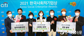(조세금융신문=홍채린 기자) 한국씨티은행과 신나는조합은 지난 23일 서울 영등포구 소재 소셜캠퍼스온에서 '2021 한국사회적기업상' 시상식을 개최했다. 일자리창출분야에서는 ㈜바탕색이엔지, 사회혁신분야에서는 ㈜공공디자인이즘, 성장분야에서는 ㈜ 트래쉬버스터즈가 각각 수상했다. 수상기업에는 상패와 함께 각각 1천만원의 상금이 돌아갔다. [조세금융신문(tfmedia.co.kr), 무단전재 및 재배포 금지]