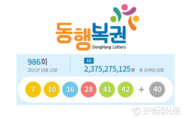 (조세금융신문=홍채린 기자) 동행복권이 23일 진행된 제 986회 로또 복권 추첨에서 7, 10, 16, 28, 41, 42번이 1등 당첨 번호로 뽑혔다고 밝혔다. 보너스 번호는 40번이다. 당첨 번호 6개를 모두 맞힌 1등 당첨자는 10명으로 23억7천528만원씩 받는다. 당첨 번호 5개와 보너스 번호가 일치한 2등은 70명으로 각 5천655만원씩을, 당첨 번호 5개를 맞힌 3등은 2천793명으로 142만원씩을 받는다. 당첨 번호 4개를 맞힌 4등(고정 당첨금 5만원)은 13만3천889명, 당첨번호 3개가 일치한 5등(고정 당첨금 5천원)은 223만1천167명이다. 당첨금은 NH농협은행 서울 서대문 본점에서, 2, 3등은 농협은행 전국 각 지점에서 당첨금을 수령할 수 있다. [조세금융신문(tfmedia.co.kr), 무단전재 및 재배포 금지]