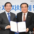 (조세금융신문) 박원순 서울시장과 문희상 새정치민주연합 비상대책위원장이 28일 국회 새정치민주연합 당대표회의실에서 열린 '당 소속 서울 지방자치단체 상.생.공.정.힐링 민생복지정책 협약식'에서 협약서에 서명한 후 기자들에게 협약서를 보이며 포즈를 취하고 있다.을지로위원회와 참좋은지방정부…