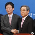 (조세금융신문=전한성 기자) 여·야 원내대표 주례회동이 30일 오전 11시 서울 여의도 국회 새정치민주연합 원내대표실에서 열린 가운데 새누리당 유승민(왼쪽 두번째)와 새정치민주연합 우윤근(오른쪽 두번째) 원내대표가 악수를 나누고 있다.