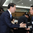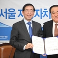 (조세금융신문) 박원순 서울시장과 문희상 새정치민주연합 비상대책위원장이 28일 국회 새정치민주연합 당대표회의실에서 열린 '당 소속 서울 지방자치단체 상.생.공.정.힐링 민생복지정책 협약식'에서 협약서에 서명한 후 기자들에게 협약서를 보이며 포즈를 취하고 있다.을지로위원회와 참좋은지방정부…