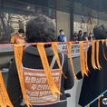(조세금융신문=진민경 기자) 사무금융노조 보험설계사지부 한화생명지회가 11일 한화생명 본사 앞에서 ‘한화생명 집회방해 만행 규탄 및 교섭촉구 결의대회’를 가졌다. 사진은 본사 앞에 결집된 한화생명 FP(금융설계사) 모습. 이날 집회는 10인 이상이 집결한 만큼 감염병 예방에 따른 자진 해산을 요구…