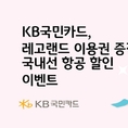 (조세금융신문=김영기 기자) KB국민카드(사장 이창권)가 가정의 달 5월을 맞아 KB국민행복신용카드 바우처 이용 고객 대상 레고랜드 무료 이용권 제공, KB Pay 여행에서 국내선 항공권 결제 시 최대 5% 청구 할인 행사를 진행한다. ◆ KB국민행복신용카드 쓰고 레고랜드 2인 무료 이용권 받으세요 5월 말일까지 KB국민행복(체크, 기업, 비씨, 선불카드 제외) 신용카드로 행사 응모 후 대상 바우처(건강보험 임신/출산 진료비, 첫만남 이용권, 어린이집 보육료) 중 1건 이상 결제 시 레고랜드 1일 이용권 2매를 제공한다. 단, 최근 6개월 KB국민 개인 신용카드 결제 이력이 없는 고객에 한해 혜택 적용이 가능하다. KB국민행복카드는 어린이집 보육료, 유아학비, 임신/출산 진료비 등 사회 서비스 바우처 이용 기능을 통합한 카드로 쇼핑, 교육 등 생활 밀착 업종 이용 시 할인 혜택도 누릴 수 있다. ◆ 국내선 항공은 KB Pay 여행에서 할인 받고 떠나요 5월 말일까지 KB국민카드(기업, 비씨, 선불카드 제외) 회원 대상으로 KB Pay > 여행 > [항공] 카테고리에서 국내선 항공권을 발권하면 결제금액의 최대 5% 청구 할인을 제공한다. 대상 항공사