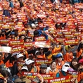 (조세금융신문=전한성 기자) 전국공무원노동조합(위원장 이충재)을 포함한 대한민국공무원노동조합총연맹, 전국교직원노동조합, 한국교원단체총연합회, 사학연금제도 개선을 위한 공동대책위원회 등 50여개 공무원단체가 함께 참여하는 '국민연금 강화! 공무원연금 개악저지! 총력투쟁 결의대회'가 28일 오후 2시 서울 여의도 문화마당에서 개최된 가운데 집회에 참석한6만 5천 공무원들이 구호를 외치고 있다.