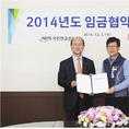 <왼쪽부터 국민연금공단 최광 이사장, 노동조합 박준우 위원장>(조세금융신문=김사선 기자) 국민연금공단(이사장 최광) 노사는 4일 정부 처우 개선 가이드라인(전년 총액 대비 1.7% 인상)을 준수한 2014년 임금협약을 6년 만에 노사 분규 없이 체결하였다고 밝혔다.지난해에 이어 ‘방만경영 정상화 과제’, 임금협상까지 4년 연속 노사협상을 원만히 타결한 공단 노사는 제2의 건단(建團)을 위한 노사간 신뢰와 상생의 경영 파트너십을 돈독히 하는 기반을 마련하였다.최광 이사장은 “원칙과 신뢰 중심의 성과창출형 노사관계 기반이 마련되었다”며, 앞으로도 “공단 노사는 협력적 노사관계를 바탕으로 고품질의 복지 서비스 제공과 사회적 책임 실천을 위해 새롭게 발돋움 할 예정”이라고 말했다.