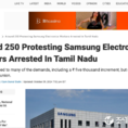 (조세금융신문=구재회 기자) 인도 남서부 타밀나두 주 첸나이 인근 지역에 위치한 삼성전자 공장의 파업 근로자 약 250명이 허가 없이 사유지에 들어가 허가 없이 시위를 벌인 혐의로 지역 경찰에 체포됐다. 시위 노동자들은 토지소유자로부터 모여 시위할 수 있는 허가를 받았다고 주장했지만, 인도 사법당국은 시위대의 연단 등을 강제로 철거했으며, 시위대 전원을 체포했다가 전원 석방했다. 인도 현지 방송 <NDTV>는 9일(현지시간) 인도 남동부 타밀나두 주 소재 삼성전자 공장에서 파업 투쟁을 벌이던 인도 삼성 직원 250명이 사유지 침입 혐의로 현지 경찰에 구금됐다가 석방됐다고 보도했다. 타밀나두 경찰은 지난 9월 허가 없이 시위를 계획한 혐의로 삼성전자 파업 근로자 100명 이상을 체포했었다. 인도 삼성 근로자들은 자신들이 결성한 노동조합을 인정하고 임금 인상과 8시간 근무, 기타 사내복지 증진 등을 요구하며 시위를 계속해왔다. 삼성은 일부 요구 사항에 동의, 급여 인상과 공장출퇴근용 통근버스 제공, 직장에서 직원이 사망할 경우 가족에게 보상을 지급하는 내용 등에 합의, 시위 노동자들과 합의했다. 삼성전자는 인도노동조합센터(CITU)를 상급노조로 둔 자